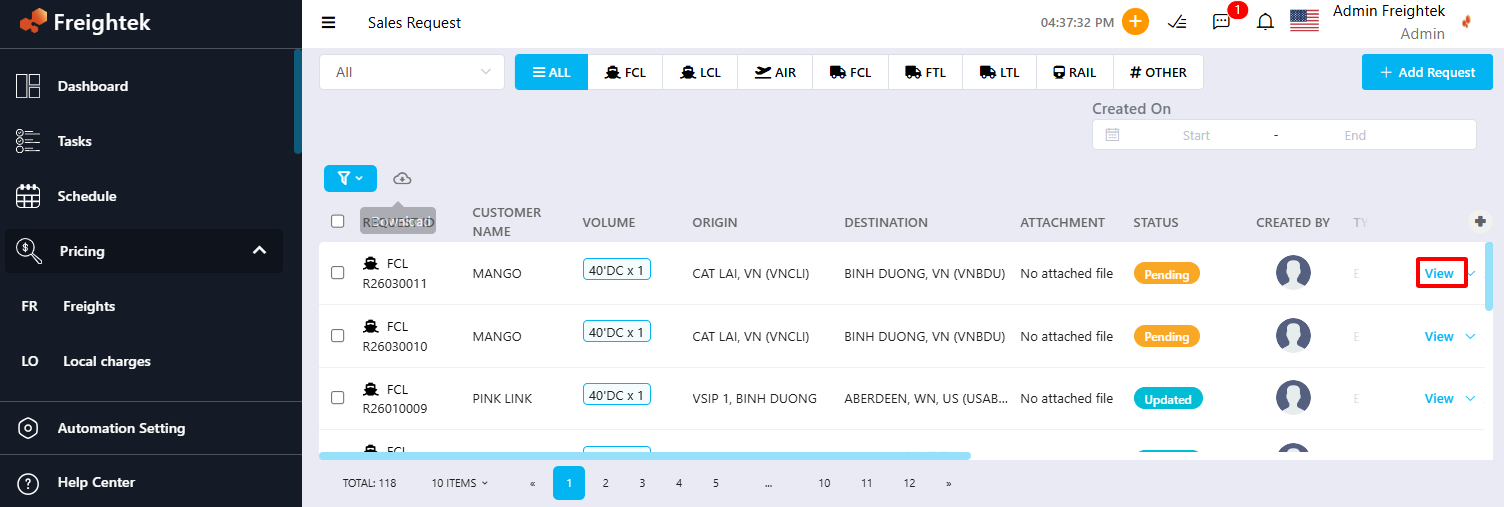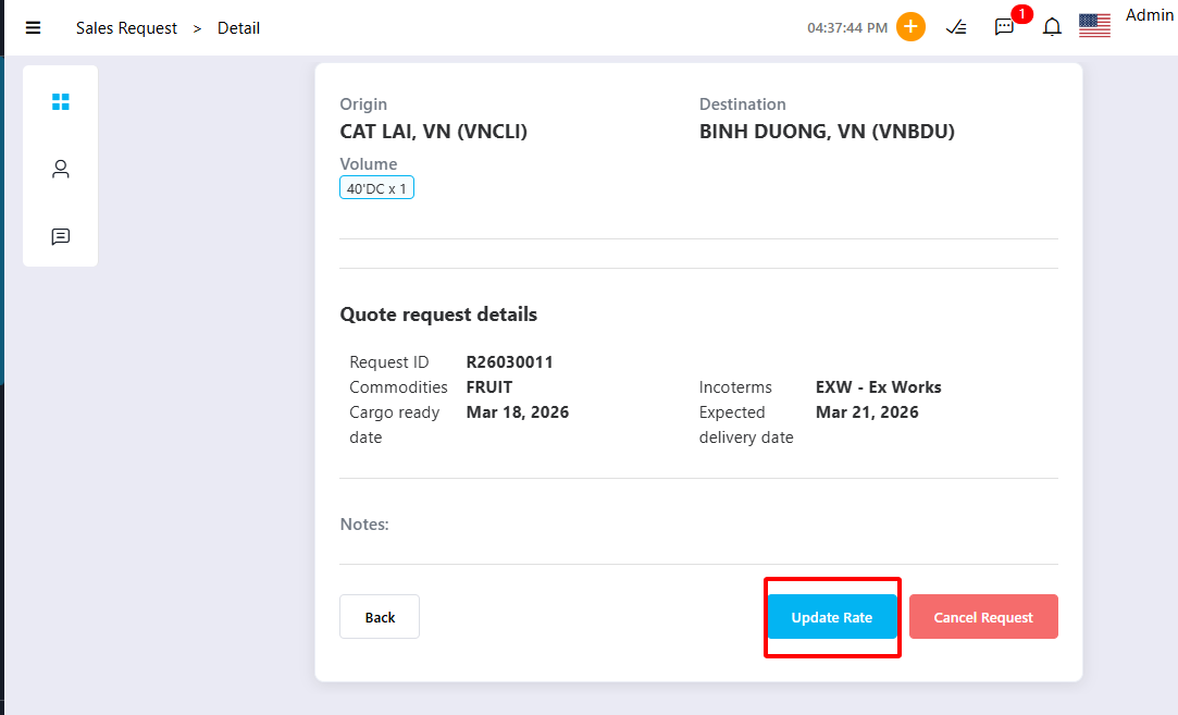 - View Nhấn Update Rate để cập nhật giá cho Request này