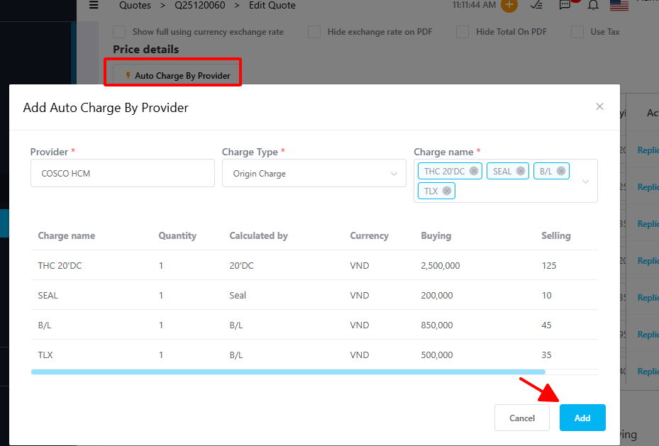 - Auto charge để add phí tự động, Nếu có tính phí trên hệ thống thì giá đã chọn sẽ tự động được tải vào cột Buying, Selling
