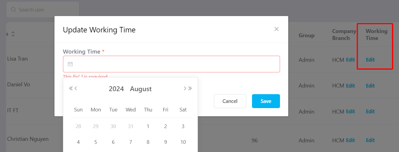 Bước 2: Nhập ngày nhân viên bắt đầu làm việc “Working time”