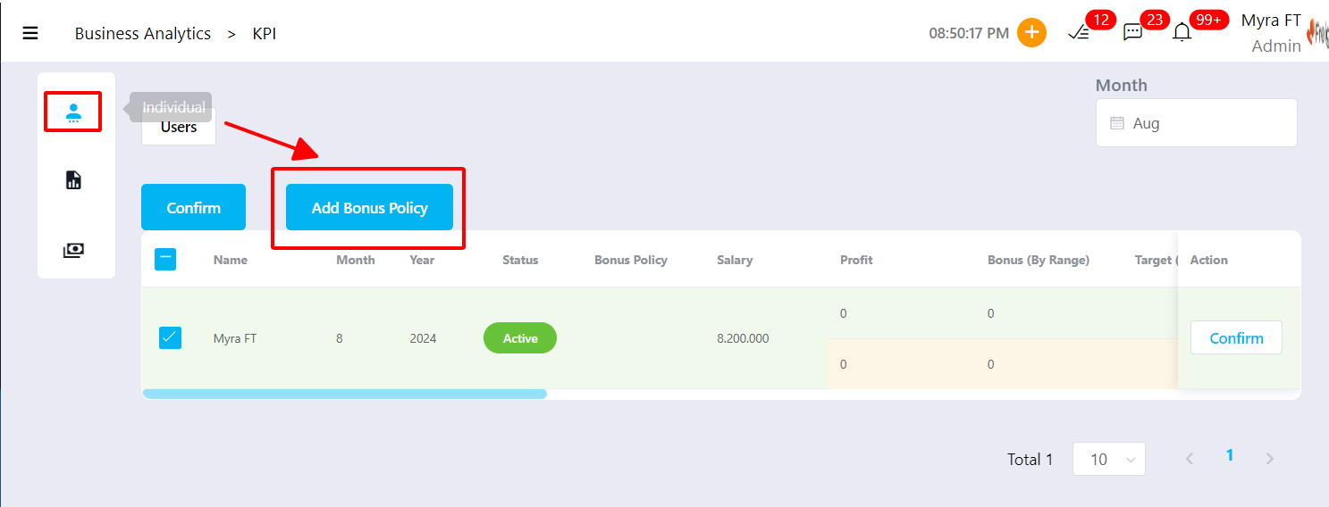 Bước 1: Click vào Individual -> Tickbox chọn nhân viên cần tính thưởng -> Add Bonus Policy