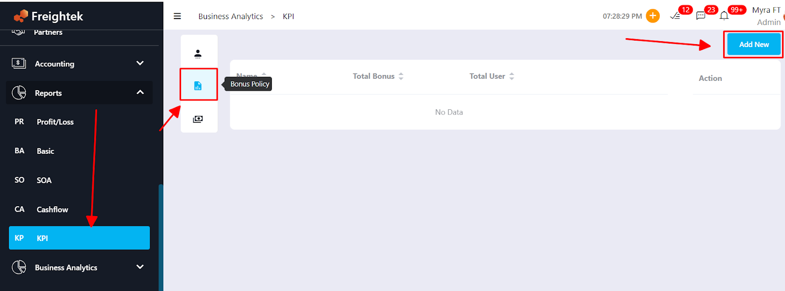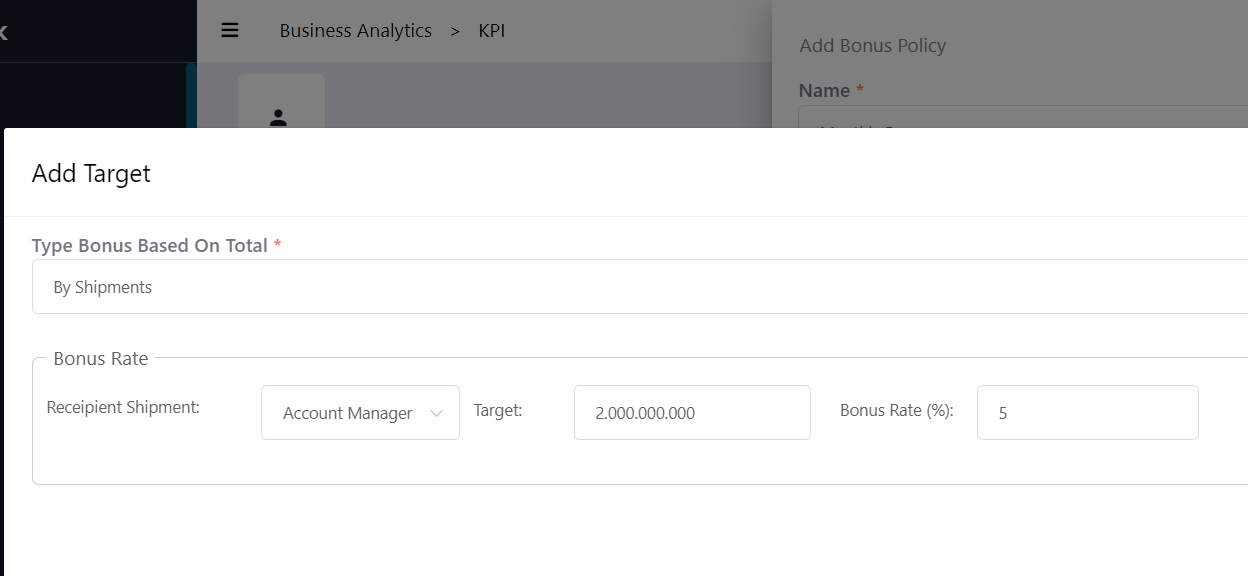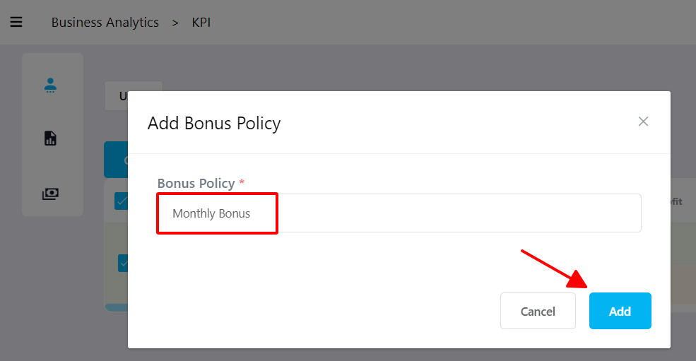 Bước 1: Vào Report -> chọn KPI -> chọn Bonus Policy -> Add new để thêm chính sách