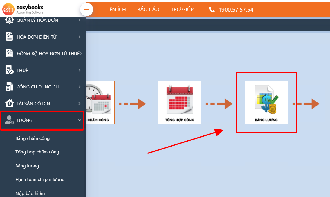 Bước 1: Ở Easybook vào mục LƯƠNG -> chọn BẢNG LƯƠNG