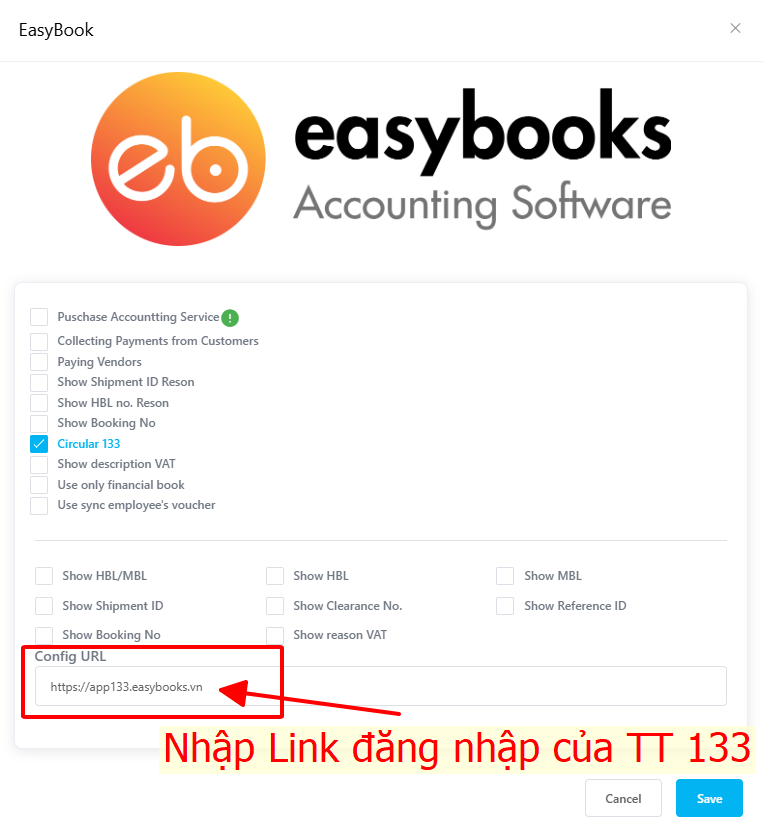 Bước 2: Tick chọn "Circular 133" & Gắn link đăng nhập của thông tư 133: https://app133.easybooks.vn -> SAVE
